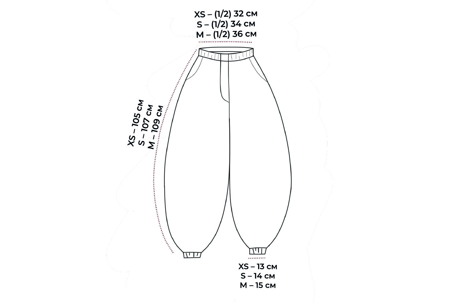Оверсайз формат XS – обхват талии 56-64 см, обхват бедер 85-90 S – обхват талии 64-75 см, обхват бедер 90-95 M – обхват талии 75-80 см, обхват бедер 95-104 Параметры модели: Рост 176 см, 87/73/95 – размер: черный – М, дюна – S Штаны: Длина по боковому шву XS-105, S-107 см, M-108 см; Ширина талии (полуобхват) XS-32, S-34 см, M-36 см; Ширина резинки штанин XS-13, S-14 см, M-15 см; Допустимы погрешности замеров 1-3 сантиметра.